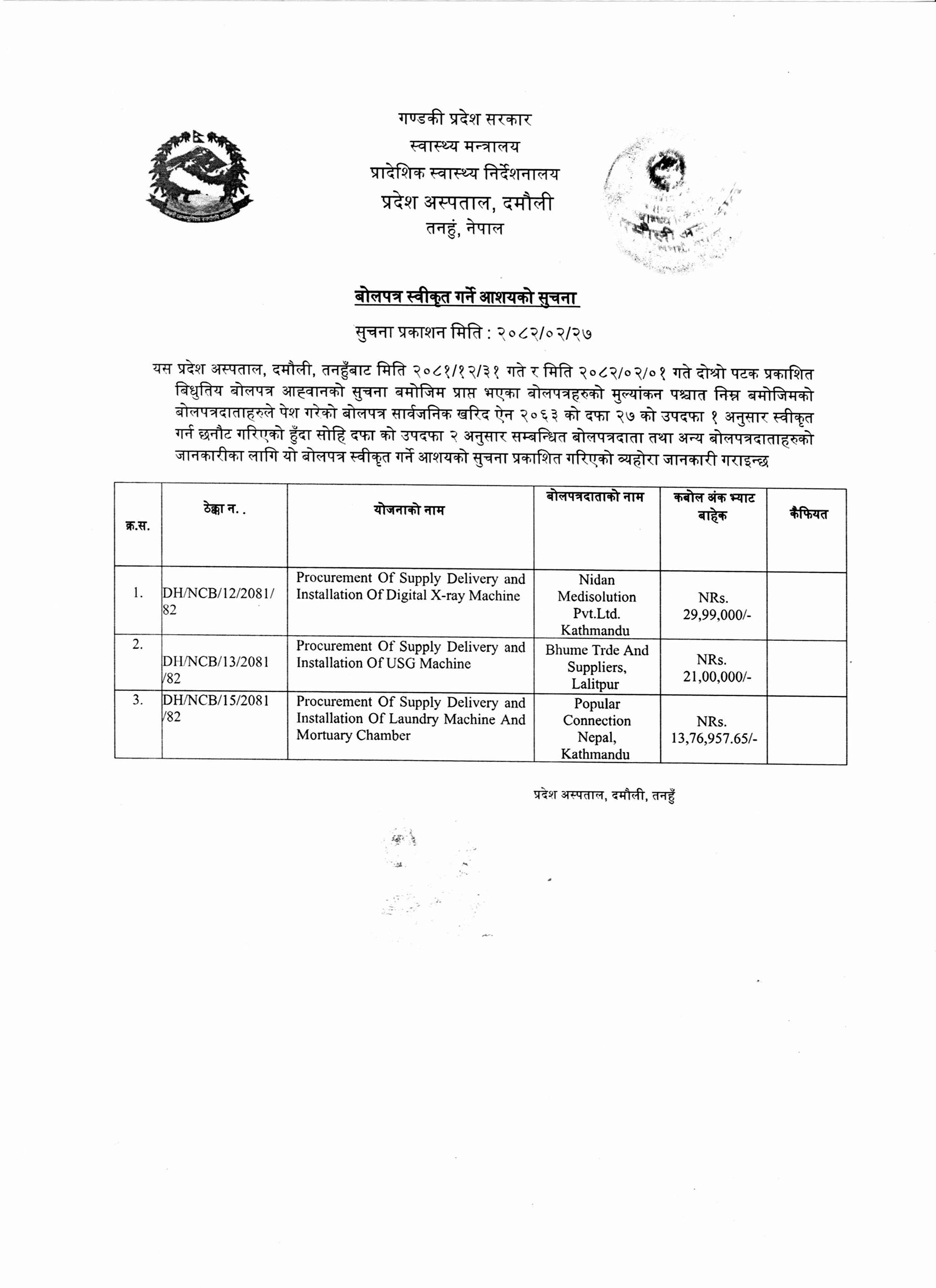 बोलपत्र स्वीकृत गर्ने आशयको सूचना – मिति : २०८२-०२-२७