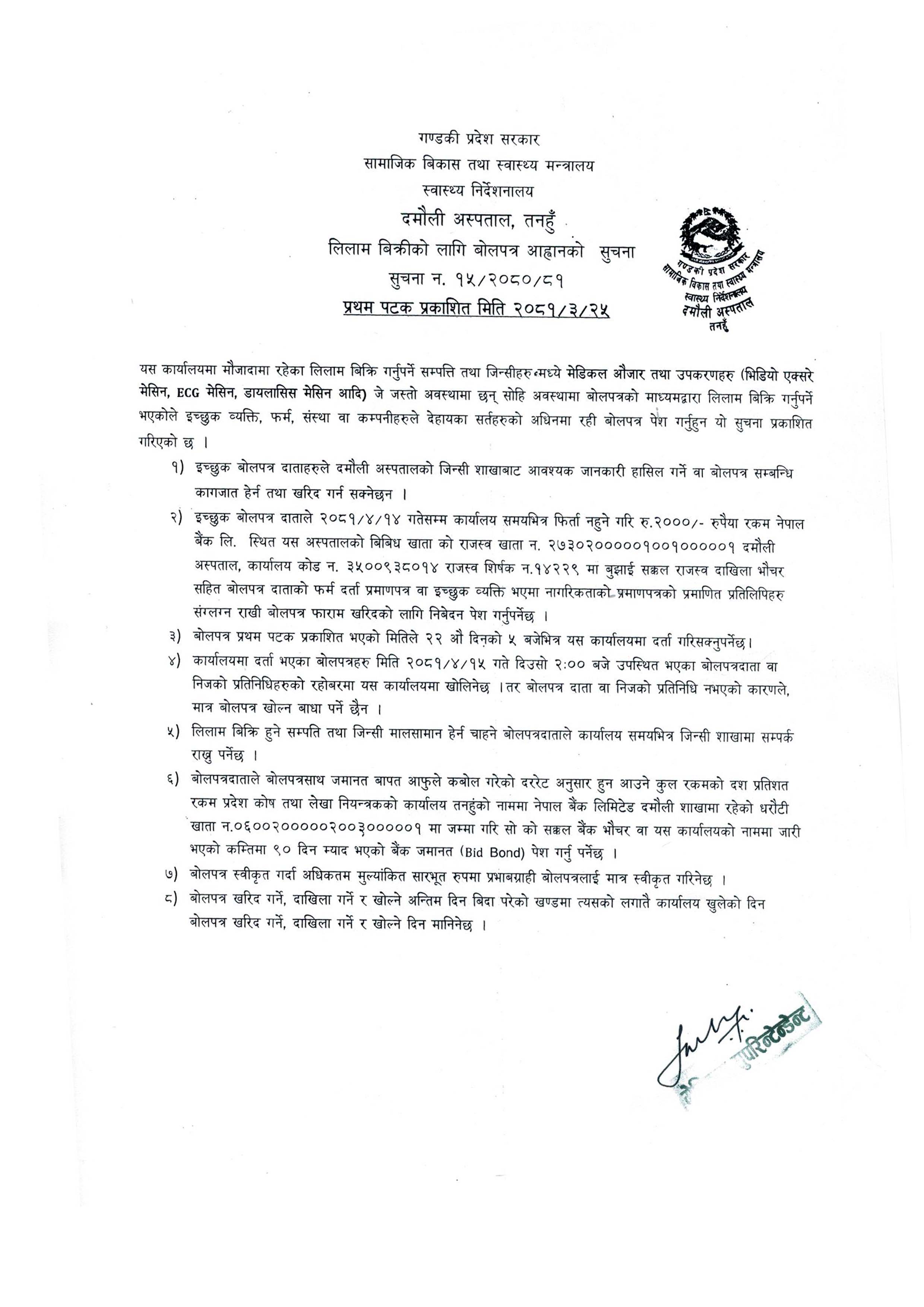 पुराना मेडिकल औजार तथा उपकरणहरुको लिलाम विक्रिको लागि वोलपत्र आव्हानको सूचना" - सुचना नं. १५/२०८०/८१
